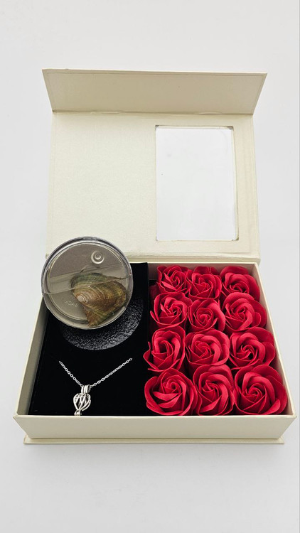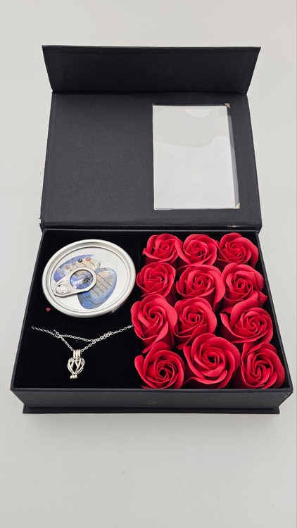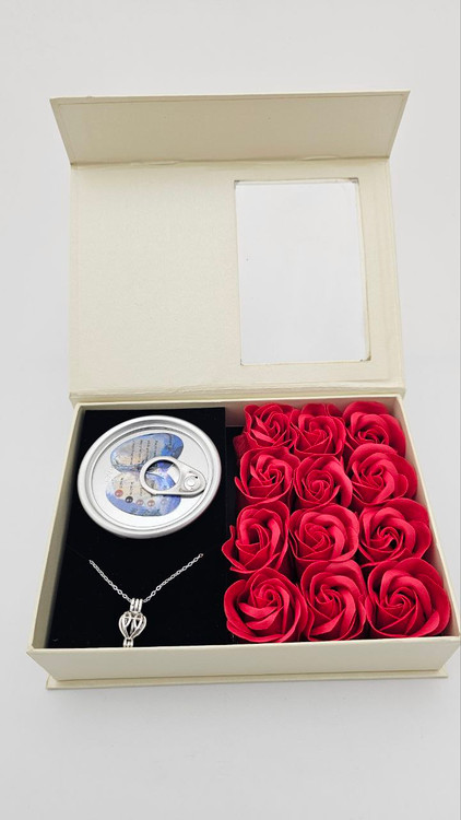 کنسرو سالم ،مروارید پرورشی ،۱۲ عدد گل رز به همراه جعبه با کیفیت